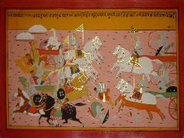 | Description / विवरण | Miniature painting based on Mahabharat - Bhishma parva depicting Dhristadyumana and Yudhisthir are fighting with Bhishma. Duryodhan is alco there to help Bhishma. |