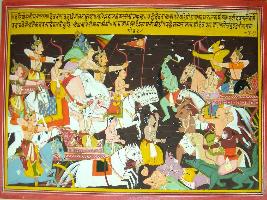 | Description / विवरण | Miniature painting based on Harivansha depicting the war between gods and demons and gods finally defeated demons. |