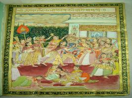 | Description / विवरण | Miniature painting depicting Krishna dancing with Radhika while other gopis are seen in dancing and singing position. Most probably it is a scene from Holi . |