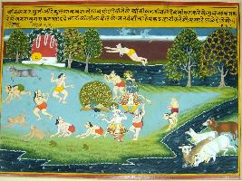 | Description / विवरण | Miniature painting based on Krishna avatar charit depicting a scene from Vrindavan where Krishna is playing flute and hearing that all the animals and gopis are dancing. Demon Bakasur is depicted coming and some animals and gopis are running due to fear. |