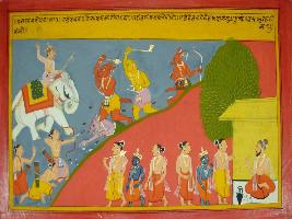 | Description / विवरण | Miniature painting based on Mahabharat - Vana parva depicting Indra reaching to Vishwakarma and asking for his bones to make vajra. Then he fought with demons and killed them. |