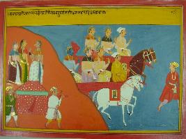 | Description / विवरण | Miniature painting based on Mahabharat - Sabha parva. Pandavas are depicted going to Indraprastha with Draupadi and wealth. |