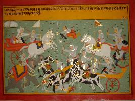 | Description / विवरण | Miniature painting based on Mahabharat - Bhishma parva depicting Satyaki and Abhimanyu are attacking the army of Gandhar and Gandhar s army destroy the chariot of Satyaki and killed his horse. Satyaki then climb over Abhimanyu s chariot. |