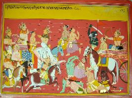 | Description / विवरण | Miniature painting based on Harivansha depicting a war scene between the armies of Indra and demons. The gods are depicted in the right side and the demons in the left side. |