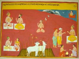 | Description / विवरण | Miniature painting based on Raghuvansha depicting a rishi talking to a king, a lonely monk seated. Below in the right side a king seated with his wife and talking, next to them a pair of cows are standing. A man seated on viman. A king donating gold coins to a poor man. Below at the corner two pundits are performing yagna. |