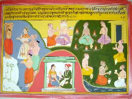| Description / विवरण | Miniature painting based on Harivansha depicting Lord Brahma with a sage in the centre. In lower middle part, a noble is talking to his wife. In the right part, Indra, Varun, and two sages are standing around a sage who is performing penance. In the left part six yogis are seated in crematorium ground, four of them are drinking wine. |