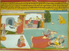 | Description / विवरण | Miniature painting based on Krishna avatar charit depicting the scene of Putana vadha by the child Krishna. It is an incomplete painting. |