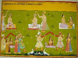 | Description / विवरण | Miniature painting based on Raghuvansha. This is a scene from Swayambar depicting the victorious king depicted taking away his queen. |