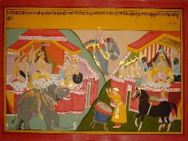 | Description / विवरण | Miniature painting based on Mahabharat - Bhishma parva depicting Bhishma is ordering his army to get ready for war and ask Dronacharya to make Garuda vyuha . Then one man beat the Nagada which indicate coming of army. In the painting camps of Pandavas and army are depicted. |