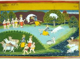 | Description / विवरण | Miniature painting based on Krishna avatar charit. This is scene depicting the killing of Aghasura the cow demon by Krishna. |
