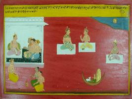 | Description / विवरण | Miniature painting based on Mahabharat - Sabha parva depicting Yudhisthir asking Krishna who is Jarasandha. Krishna says once there was a king who by doing yagna daily become bright like sun and hard like earth, he is his son. |