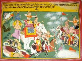 | Description / विवरण | Miniature painting based on Harivansha depicting war between Chandrama and Varun. Indra and Vishnu are also depicted in the war. A man is seen in a cave in dhayan in the right bottom corner. The painting is unfinished. |
