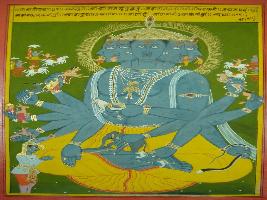 | Description / विवरण | Miniature painting based on Shri Bhagwat Gita. Arjun asking to Krishna that Raajroop of Krishna is fear some and he bows to it. This roop is depiction of Adi purush. |