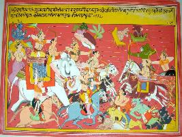 | Description / विवरण | Miniature painting based on Harivansha depicting war between Gods and demons. On the right side Lord Vishnu is sitting on Garuda, Lord Indra with his vehicle and many other gods on horse back with bow and arrows, while on the left side the demons are depicted. |