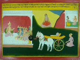 | Description / विवरण | Miniature painting based on Mahabharat - Sabha parva depicting Yudhisthir is saying that Bhim and Arjun are his breath and Krishna is his heart. Then says that he feels like going to sanyas then Arjun stands and holding bow and arrow and says for land, prestige and power kshatriya will fights. |