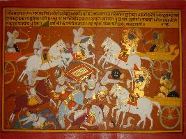 | Description / विवरण | Miniature painting based on Mahabharat - Bhishma parva depicting horses, elephants, and many weapons like Parigh, Mudgar, arrows, swords and mace of Kaurvas army cannot be able to defeat Arjun. After the victory Arjun and Krishna is blow their conch in the battle field. |