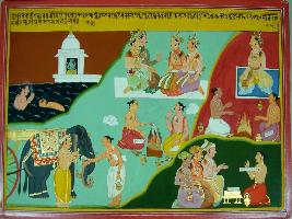 | Description / विवरण | Miniature painting based on Harivansha. Two people are depicted taking bath in a pond near Vavahas temple, in the middle part four royal figures are depicted, two priest performing yagna and two men with elephant and on the right side a king is performing yagna and priest talking to three royal people. |