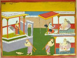 | Description / विवरण | Miniature painting based on Krishna avatar charit depicting Narad muni sitting with a person in another scene a man keeping a child to ground and a woman looking all these from top of palace. |