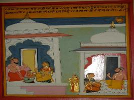 | Description / विवरण | Miniature painting based on Panchtantra depicting wife talking to sage husband. Then husband replied that if young daughters at home get their menstruation then that home is not pure. |