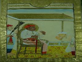 | Description / विवरण | Miniature painting depicting Maharana Amar Singh sitting on a ornamented chair flanked by a male attendant and a man is seen that paying respect to him. |