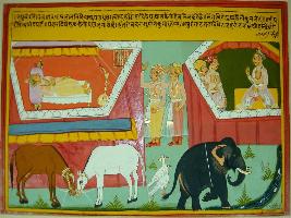| Description / विवरण | Miniature painting based on Raghuvansha depicting Kumar lying on a bed in a tent at the right side. In front of tent, horses are tied. Two nobles are shown outside the tent. At the upper left, Kumar wakes up and shown talking to both the nobles in his tent. At the lower left, an elephant is shown near a river. |