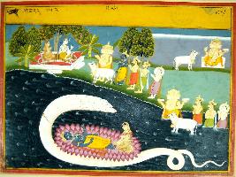| Description / विवरण | Miniature painting based on Krishna avatar charit depicting Krishna lying on Sheshshyayi in his Baikunth and rath is seated and his feet. Shiv and Parvati seated on tigers leather giving blessing to Brahma, Krishna and other royal person. Brahma is shown along with Nandani. |