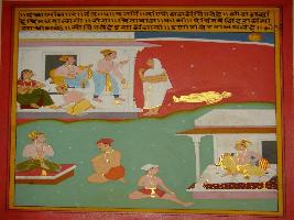 | Description / विवरण | Miniature painting based on Panchtantra depicting the life of human being. At the upper right two men are talking to a woman probably a widow , next to whom a body lying on ground is seen. Below them at the lower right corner two male figures are seen sitting face to face. At the lower left corner, one man sitting on a couch and taking to another person sitting on ground. At the upper left corner the bright sun is seen. |