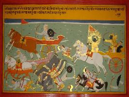 | Description / विवरण | Miniature painting based on Mahabharat - Bhishma parva depicting Arjun creating fear in the war field by killing many cavalry and infantry soldiers. |