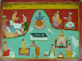 | Description / विवरण | Miniature painting based on Harivansha. On the upper part, a king and his two men are depicted feeding and cleaning cows, a person talking to two priests. In the lower part Vishnu is depicted sitting on lotus with two peacocks, a man writing, a Brahman accepting scripture from another seated Brahman, and a king performing Ashwamegh yagna. |