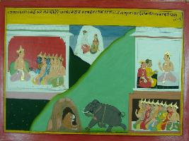 | Description / विवरण | Miniature painting based on Mahabharat - Sabha parva. Krishna is depicted telling Yudhisthir about Jarasandha that he is very powerful because he had performed yagna for Shiv. |