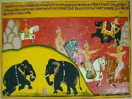 | Description / विवरण | Miniature painting based on Raghuvansha depicting fighting between two kings. At the upper right, sun is shown riding on his seven headed horse depicting the start of the day. At the right side, war scene is depicted. kings shown riding on their horses and shooting arrows towards each other. At the lower left, two elephants are shown fighting with each other. |