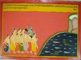 | Description / विवरण | Miniature painting based on Mahabharat - Vana parva depicting Lomash is telling Yudhisthir about the story that god reaches to Agastsya sage. Sages ask them about the purpose of their coming. and Agastsya took them along with him at sea shore. |