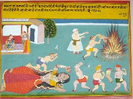 | Description / विवरण | Miniature painting based on Krishna avatar charit depicting a disguised female Putana and talking away Krishna pretending to feed him milk. As Krishna sucked her milk. She died instead of killing him. She turned into her original identify people of Mathura are biting her and cutting her body into numbers of pieces, pieces are got to be banned into fire. |
