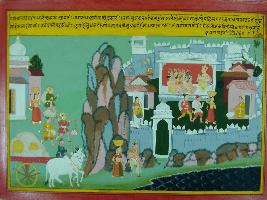 | Description / विवरण | Miniature painting based on Mahabharat - Sabha parva depicting in one corner about the social life of general people and other corner Sabha is going on in fort and Bhim is calling Jarasandha for fight. |