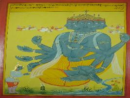 | Description / विवरण | Miniature painting based on Shri Bhagwat Gita. Arjun asking Krishna that every human beings cloths near the mouth of Raajroop of Krishna is looking like a kite which is flying. |