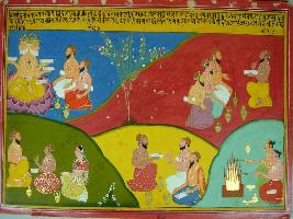 | Description / विवरण | Miniature painting based on Harivansha. On the upper part Brahma is depicted with two priests, a priest sitting with three sages. On the lower part, a priest with two women, a priest with two sages and two priests performing yagna are depicted. |