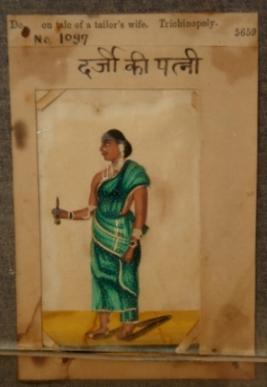 | Description / विवरण | Miniature painting depicting wife of a tailor in standing position and holding a scissor in her right hand. |