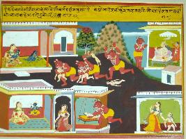 | Description / विवरण | Miniature painting based on Krishna avatar charit depicting scenes in which new born children are being killed by mythical animals as ordered by the king Kansa. |