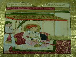 | Description / विवरण | Miniature painting depicting Jagat Singh ji in sitting position flanked by a male attendant. His right hand is handle a sword. |