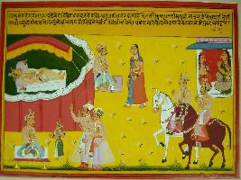 | Description / विवरण | Miniature painting based on Raghuvansha depicting two kings sitting on horses at lower left side. Above it two women shown talking to each other in their house. At the lower right king is talking to goddess Lakshmi and ministers are standing near by. Above it, king is shown lying on his bed in his tent, to its left a woman is coming to meet the king. |