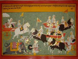 | Description / विवरण | Miniature painting based on Mahabharat - Bhishma parva depicting soldiers of Kalinga are fighting Bhim and Bhim standing in the middle of the battle field. It alsi depicts Dristadyumana is coming to take him on his chariot and Satyaki is praising Dristadyumana. |