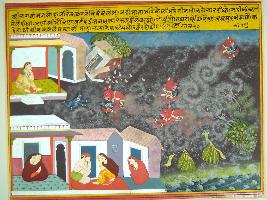 | Description / विवरण | Miniature painting based on Krishna avatar charit depicting a scene in which cow headed demon talking away Krishna from Yashoda and villagers are shown crying in lower part. |