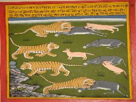 | Description / विवरण | Miniature painting based on Panchtantra depicting the story of an old tiger, fox and an donkey in which fox cheated the donkey and take him to the tiger. The tiger killed the donkey and both the fox and tiger eat the donkey. |