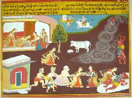 | Description / विवरण | Miniature painting based on Krishna avatar charit depicting killing of cow headed demon named Chakravat. In upper left portion Chakravat holding Krishna. In the middle left, Krishna is shown strangulating demon. At the lower portion, Krishna is show over killed demon and one gopi taking him. |