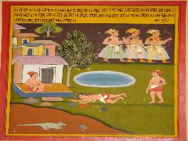 | Description / विवरण | Miniature painting based on Panchtantra depicting a monkey telling a story of a prince to a crocodile. The monkey said that the prince become expert in everything that he can defeat everyone. On top three other princes are depicted going forward. |
