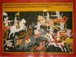 | Description / विवरण | Miniature painting based on Mahabharat - Bhishma parva depicting many fighters like Satyaki, Dristadyumana and Bhim are coming to fight with Bhishma. Bhishma kills the horse of Bhim, then Bhim throws a spear which Bhishma cut with an arrow. |