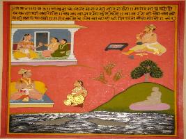 | Description / विवरण | Miniature painting based on Panchtantra narrating the story of a wise monkey and a foolish crocodile at the lower part. At the upper right corner mother is seen narrating this story to her sons. Next to them a man is seen in seated pose and eating something. At the right centre one men sitting on a couch talking to a woman. |