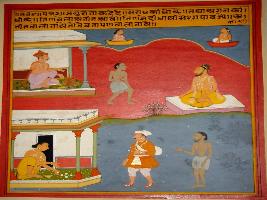 | Description / विवरण | Miniature painting based on Panchtantra depicting Manu telling that he who performs shradh and yagna for three times will attain heaven. |