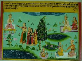 | Description / विवरण | Miniature painting based on Raghuvansha depicting a king seated on the right upper corner of the painting along with four women and on the left upper corner a couple is seen seated and below it king and Queen are seated. |