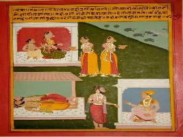 | Description / विवरण | Miniature painting based on Panchtantra depicting in the upper part three women with a child and a cat catching rats and three rats entering their holes. In the lower part two persons are shown sleeping together and left side a sage is talking to a man. |